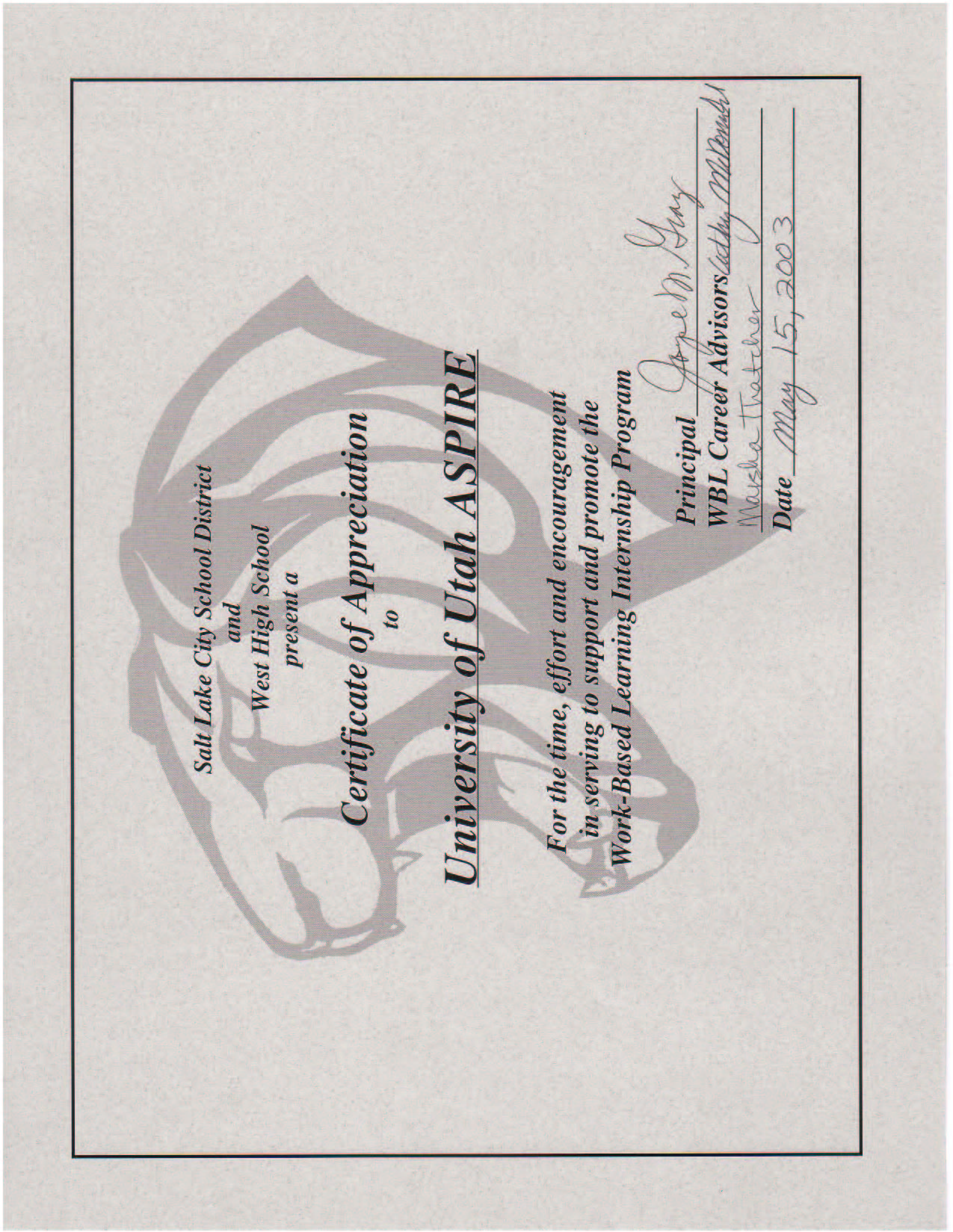 ASPIRE - our educational outreach project - received an official Certificate of Appreciation from West High School: "For the time, effort and encouragement in serving to support and promote the Work-Based Learning Internship Program" | View Certificate in .PDF or .JPG