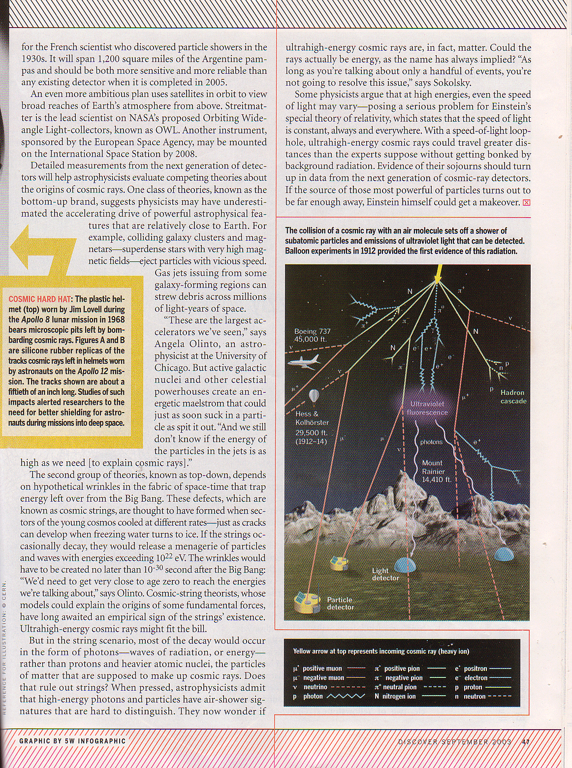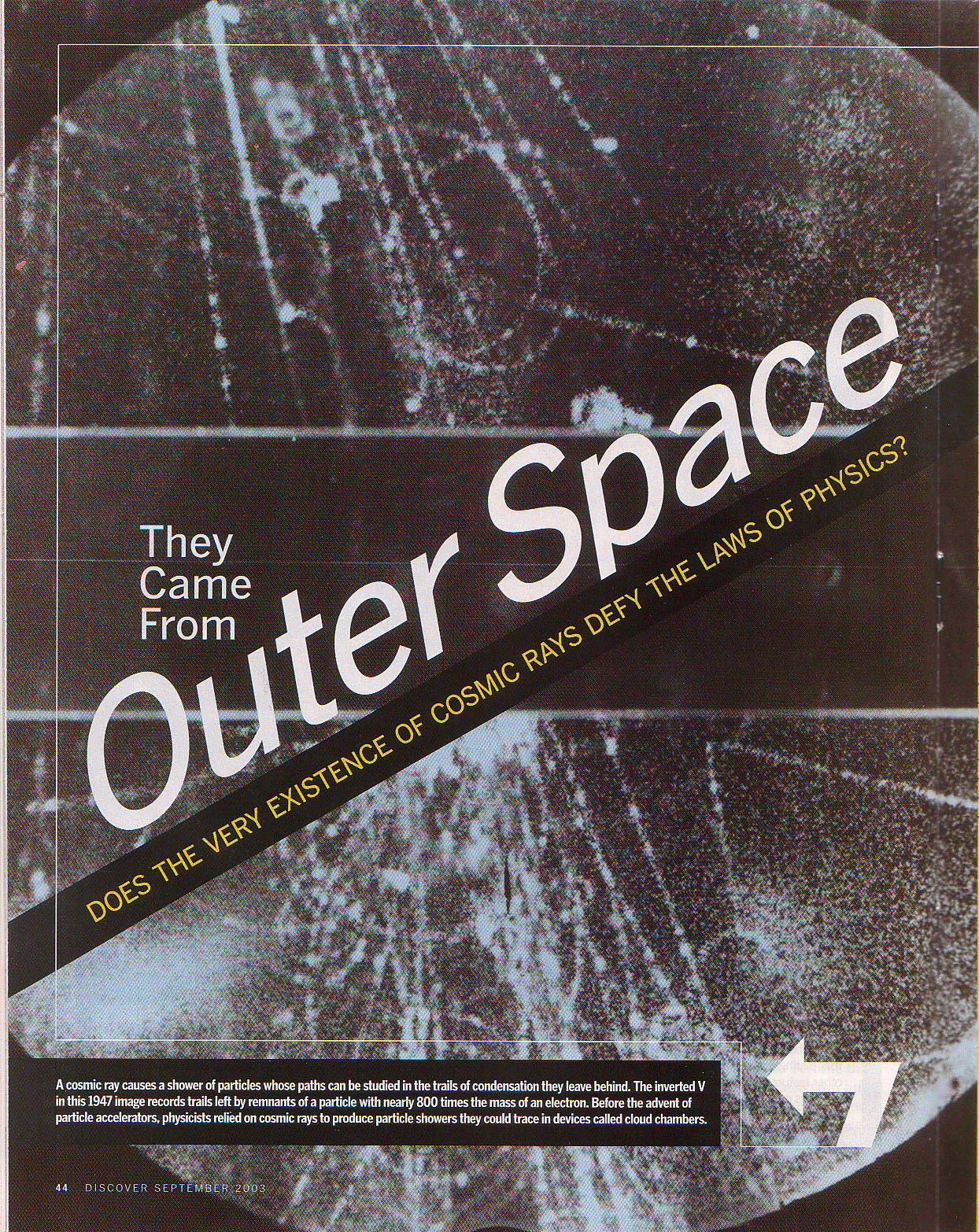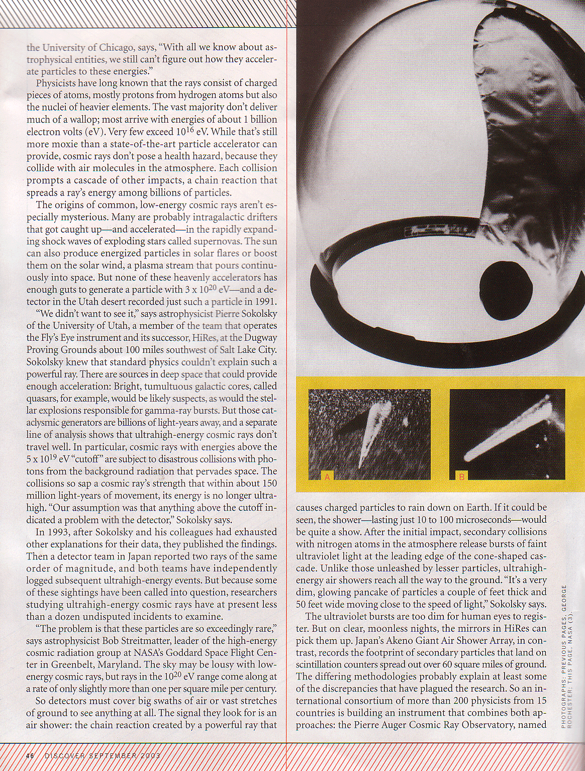 HiRes's Pierre Sokolsky quoted in Discover© (Vol. 24, No. 9 September 2003) article, "They Came From Outer Space: Does The Very Existence Of Cosmic Rays Defy The Laws Of Physics?" (pg.44-47) | view (.PDF) | (.JPG) 1/2/3/4/5