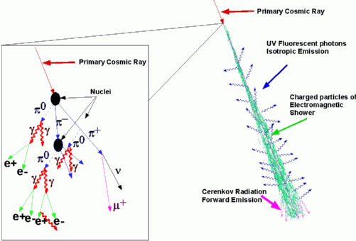 The particles in a typical air shower are all traveling just below the speed of light in vacuum. In air, however, they are actually traveling faster than the speed of the light in the medium. The result is that they emit light, called Cerekov radiation, analogous to the sonic boom of a supersonic aircraft. As shown in the top figure of this article, the Cerenkov light is beamed in the forward direction of the air shower and can be measured with optical detectors. Two examples of this sort of detectors are the Dual Imaging Cerenkov Experiment (DICE) and the Broad LAteral Non-imaging Cerenkov Array (BLANCA). Both of these were operated with the CASA-MIA array. DICE was an imaging detector similar in design to the High-Resolution Fly's Eye Experiment, and views the shower maximum directly. BLANCA measures the lateral profile of the Cerenkov light and infers Xmax from this data. More information can be found from the BLANCA home page (at The InterNet Archive).