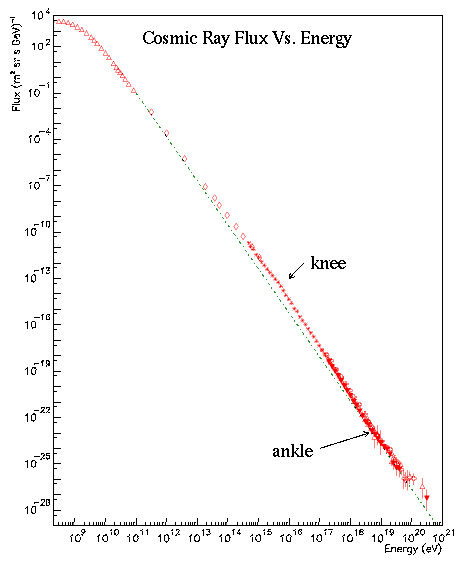 The techniques by which cosmic rays in a given energy range are detected depend critically on the rate of arrival. In the energy spectrum below (which you already saw in the section on Ultra-High Energy Cosmic Rays), you see that in the energy range of 1011-1012 eV, the flux of cosmic rays is roughly 1 particle per square meter (one square meter is roughly 10 square feet). This rate is high enough to allow direct detection.