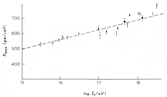 Following the above convention, the depth of shower maximum is denoted "Xmax". The figure above shows a compilation of measured average Xmax as a function of energy [1-3]. With a value of about 500 g/cm2 at 1015 eV, the average Xmax for cosmic ray showers increases by 60-70 g/cm2 for every decade of energy.