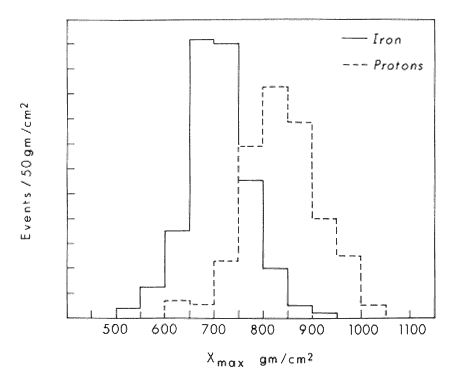 The figure above shows simulated Xmax distributions for air showers induced by iron nuclei and protons with energies of 1019 eV. The two distributions are separated, but each shows siginificant fluctuations which makes even-by-event discrimmination very difficult. Instead, the composition study is restricted to a statistical study of average Xmax over large number of events.