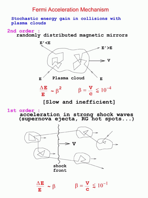 One of the earliest theories on the acceleration of cosmic rays was proposed by Enrico Fermi in 1949 [1]. It became known as the "Second Order Fermi Mechanism". In this model, particles collide stochastically with magentic clouds in the interstellar medium. Those particles involved in head-on collisions will gain energy (similar to a sling-shot process used to accelerate spacecrafts around planets), and those involved in tail-end collisions will lose energy. On average, however, head-on collisions are more probable. In this way, particles gain energy over many collisions.