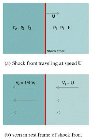 When viewed in the rest frame of the shock front as in figure (b) below, particles are arriving from downstream with speed v1=U and exiting upstream at speed v2. Conservation of the number of particles implies the relation: r1 v1=r2 v2. In the case of strong shock we expect r2/r1=(g+1)/(g-1), where g is the usual ratio of heat capacities. For a fully ionized plasma, one expects g=5/3, leading to a velocity ratio of v1/v2=4.