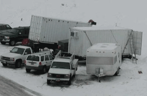 Starting in February, 2002, the HiRes Experiment is operating a mobile detector unit at Black Rock Mesa, just south of the City of Delta in Millard County, Utah. Currently, the mobile unit consists of a single standard HiRes mirror unit accompanied by a control module. Both are housed in shipping containers shown in the photograph below.
